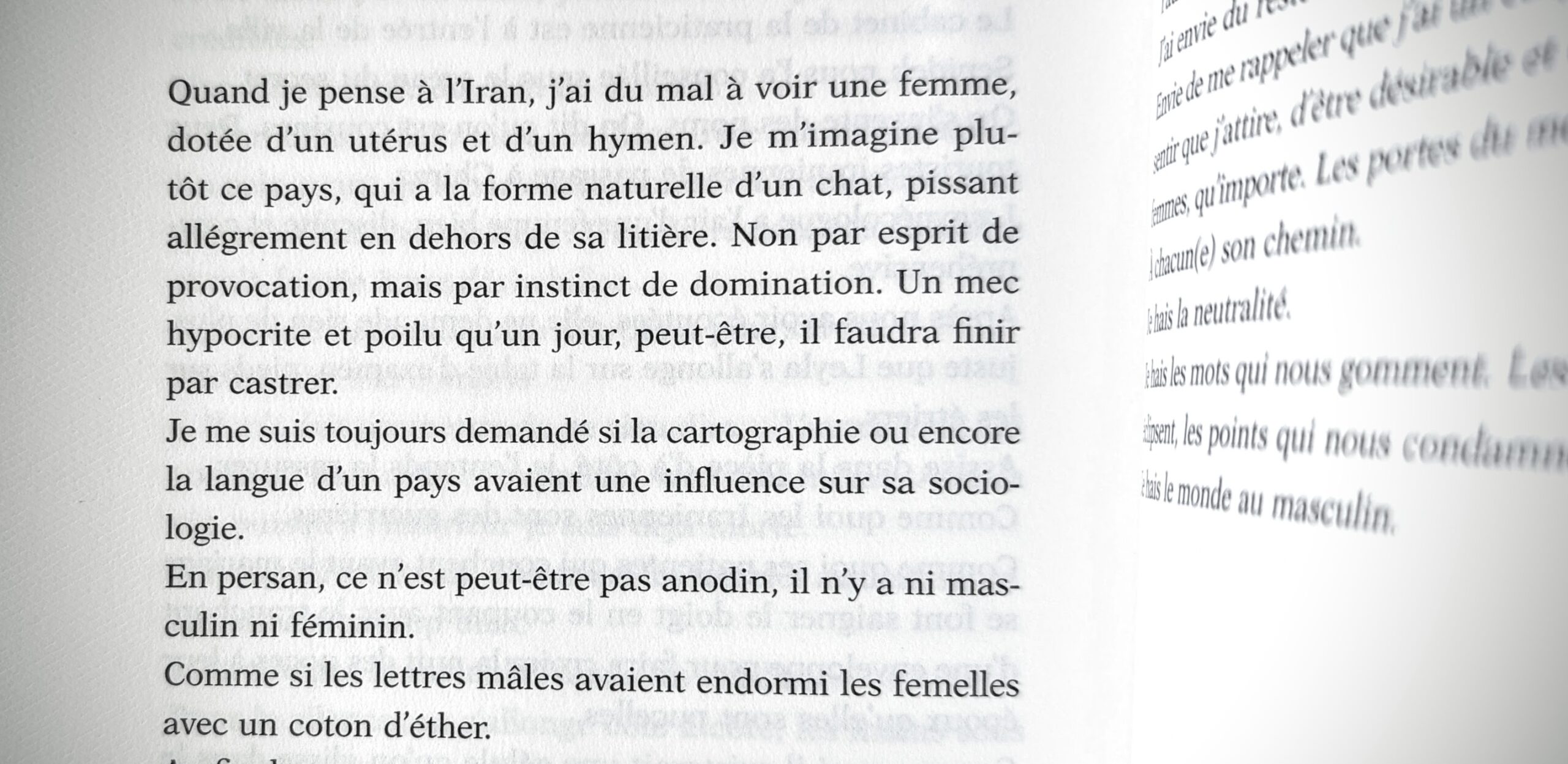 Quand je pense à l'Iran, j'ai du mal à voir une femme, dotée d'un utérus et d'un hymen. Je m'imagine plutôt ce pays, qui a la forme naturelle d'un chat, pissant allègrement en dehors de sa litière. Non par esprit de provocation, mais par instinct de domination. Un mec hypocrite et poilu qu'un jour, peut-être, il faudra finir par castrer.