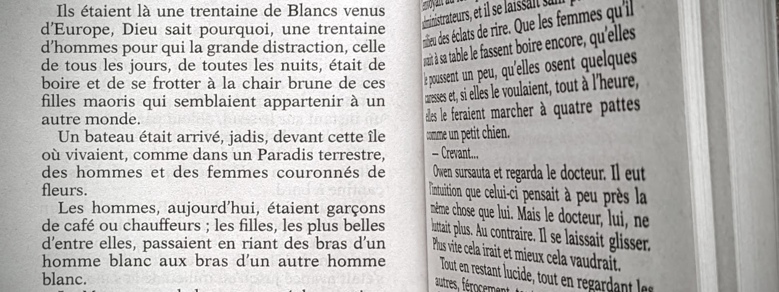 Une fois encore avec Simenon, l’histoire semble prétexte aux portraits. À Tahiti dans les années 40, les hommes blancs s’encanaquent entre men’s club, alcool, poker et jeunes tahitiennes. Un tableau abrutissant de vacuité sous le soleil dans un paysage magnifique.